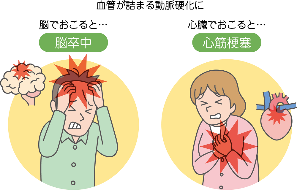 血圧が高いと、収縮のたびに血管壁に強い圧力がかかり、徐々に傷ついていきます。傷ついた血管には、コレステロールなどが入り込みやすくなって、血管のなかが狭くなったり、血管が硬くなったりします。これが「動脈硬化」です。動脈硬化が進行すると、血管が詰まったり、破れたりします。心臓の血管でおこると「心筋梗塞」、脳の血管でおこると「脳卒中」など、命の危険がある重大な病気を招きます。高血圧は、血管の老化を早める原因になるのです。
