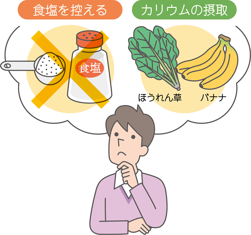 高血圧対策の基本は生活改善です。重症の高血圧では薬が必要になりますが、その場合も生活改善と治療を同時に行っていきます。食生活では以下のポイントに気をつけて血圧を上手に管理しましょう。