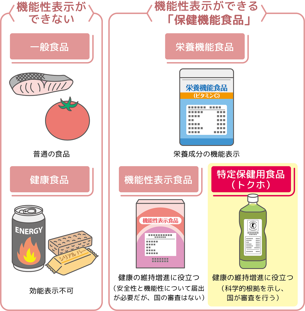 トクホは「特定保健用食品」を略した言葉です。安全性や有効性について国が定めた基準に従って、食品の機能が表示されている食品を「保健機能食品」といいますが、トクホはその1つです。