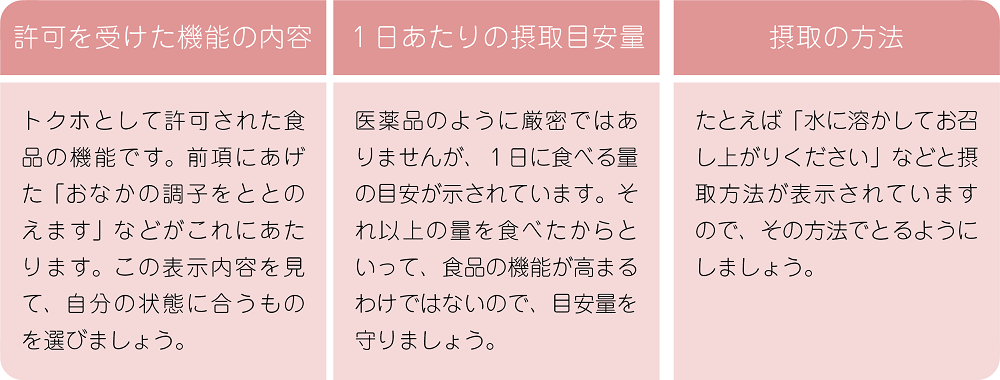 トクホには、一般食品にも表示が義務づけられている賞味(消費)期限や保存方法などのほかに、トクホならではの記載があります。なかでも次の項目は、しっかり確認しましょう。